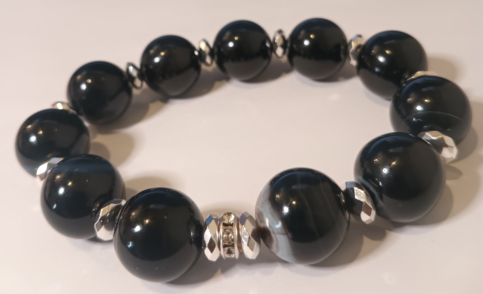 Single chunky gemstone beaded bracelet made with Black Banded Agate & Hematite accented in silver.
