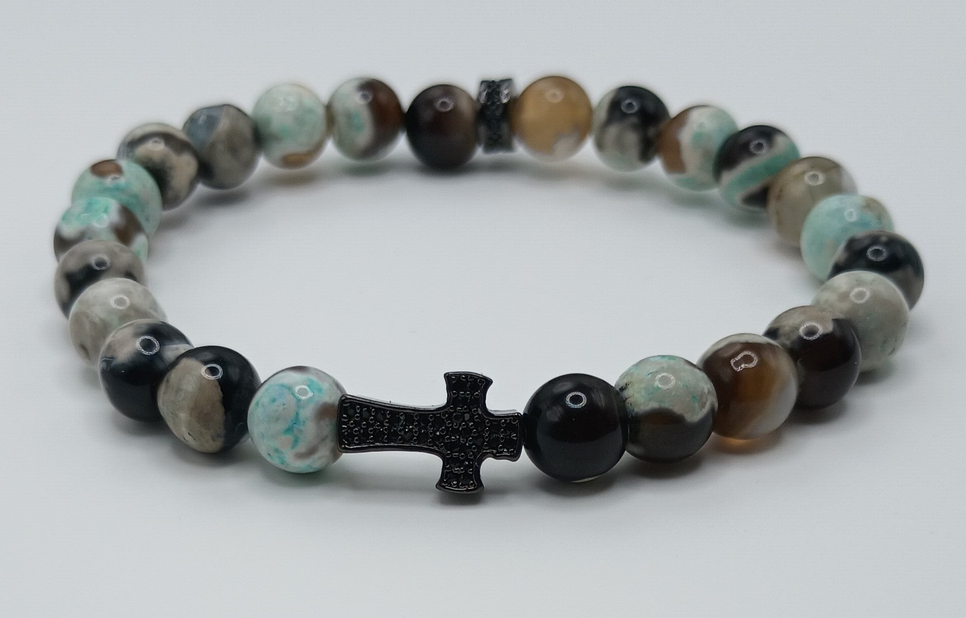 8mm Single gemstone beaded bracelet made including a gun metal black Pave Cross Bead.