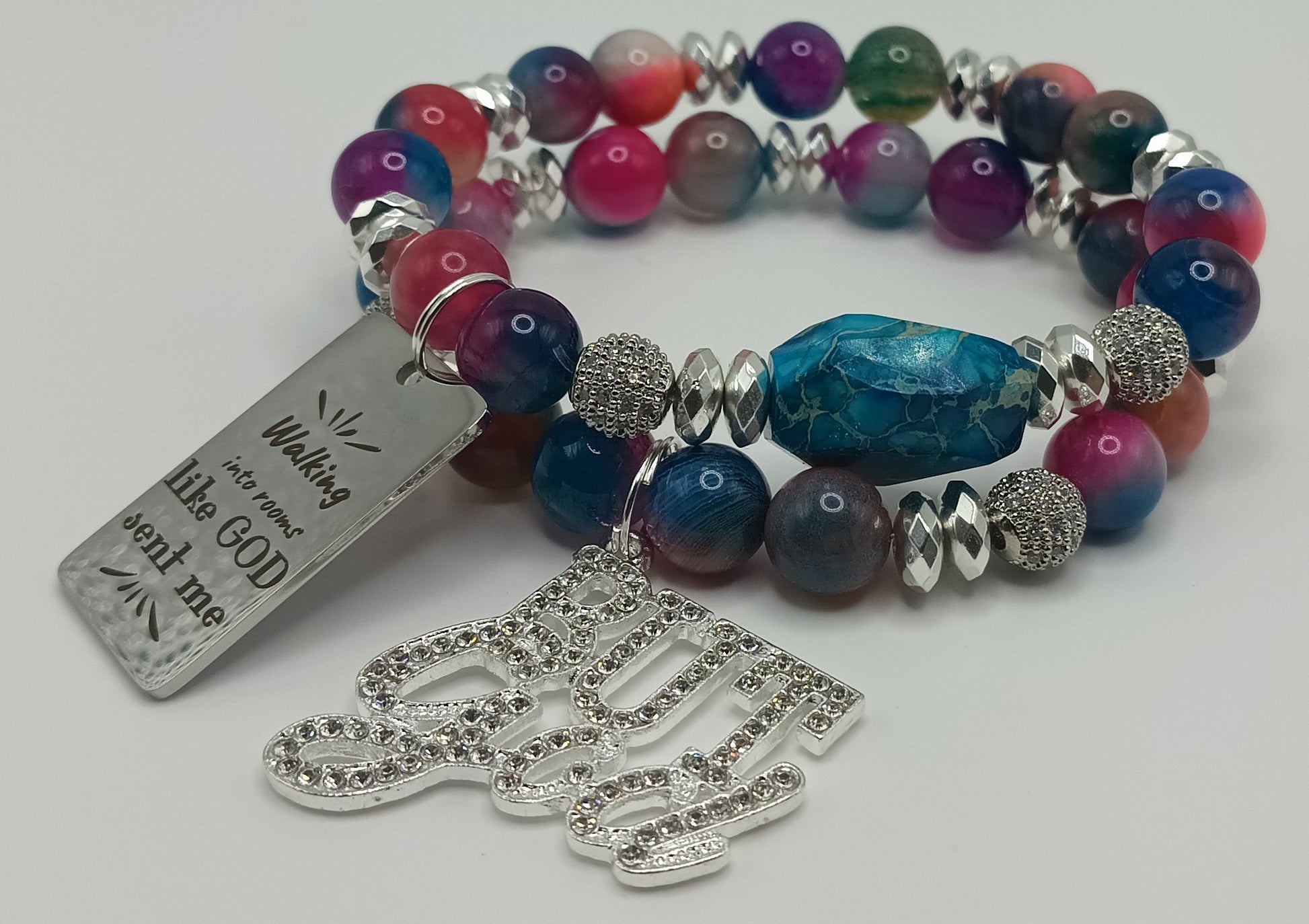 The set includes two stackable pieces with Pink/ Purple Jade and silver accents, as well as a charm with the empowering message "BUT GOD" & Walking Into Rooms Like God Sent Me‼️