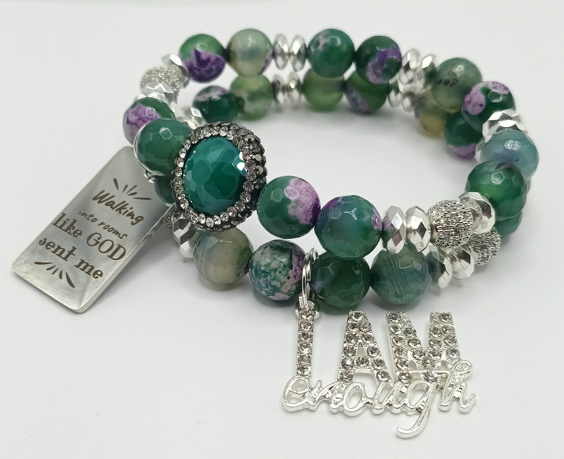 The set includes two stackable pieces with green purple Fire Agate and silver accents, as well as a charm with the empowering message "I Am Enough" & Walking Into Rooms Like God Sent me‼️