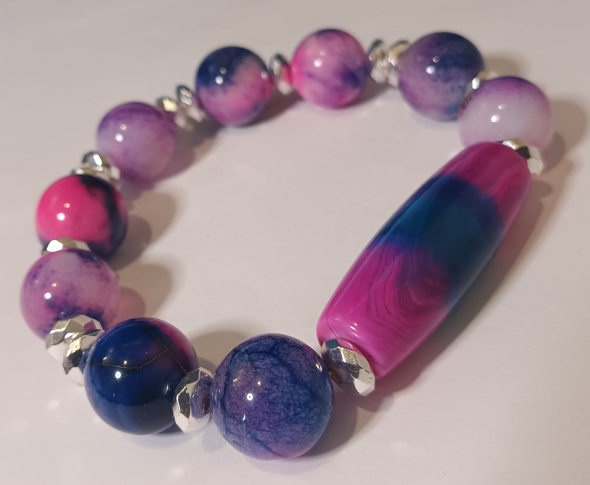 Single chunky gemstone beaded bracelet made with Multi Colored Fire Agate, Hematite, accented in silver and with Agate focal bead.