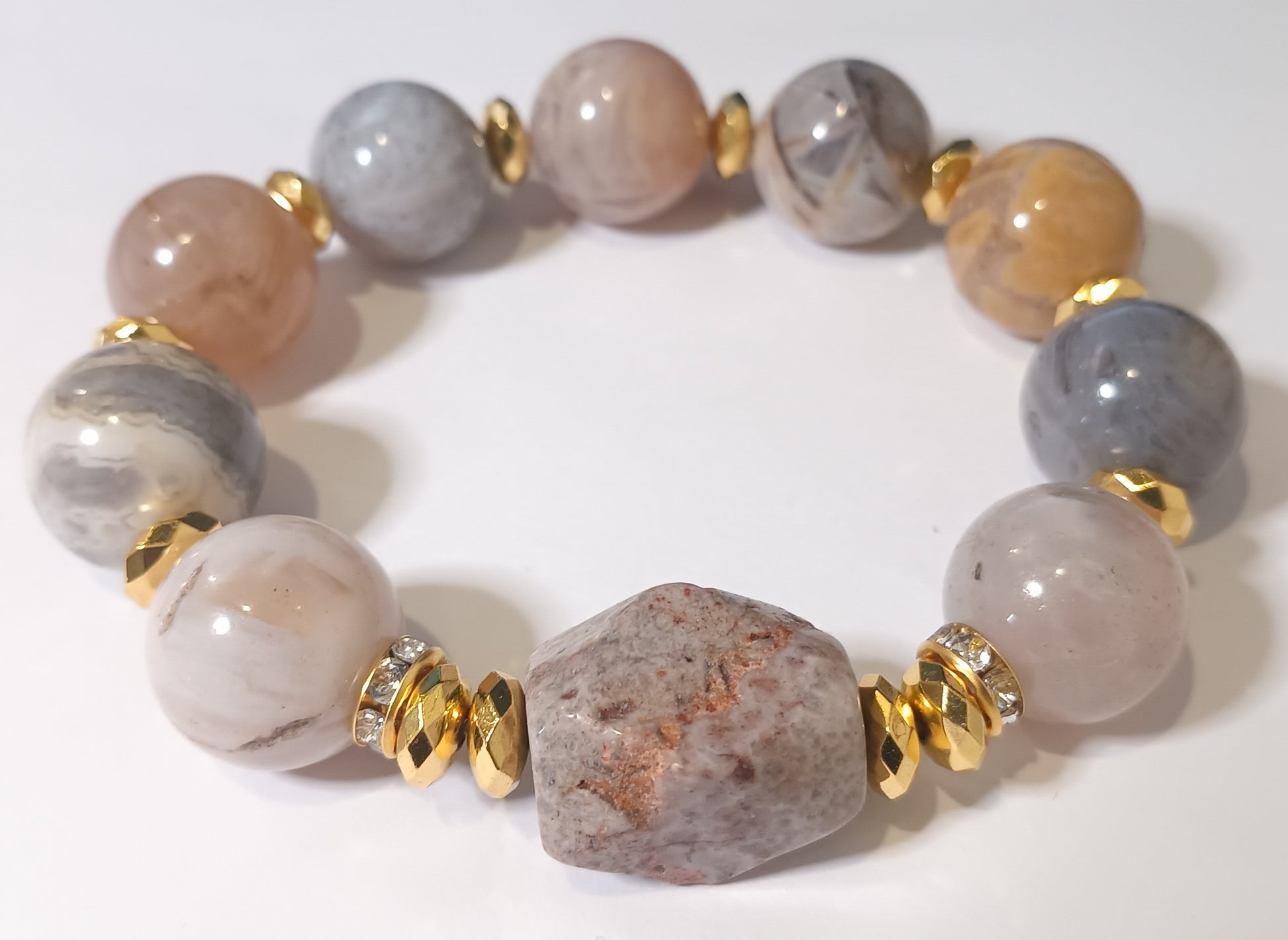 Single gemstone beaded bracelet made with Crazy Lace Agate gemstones accented in gold with large focal bead!