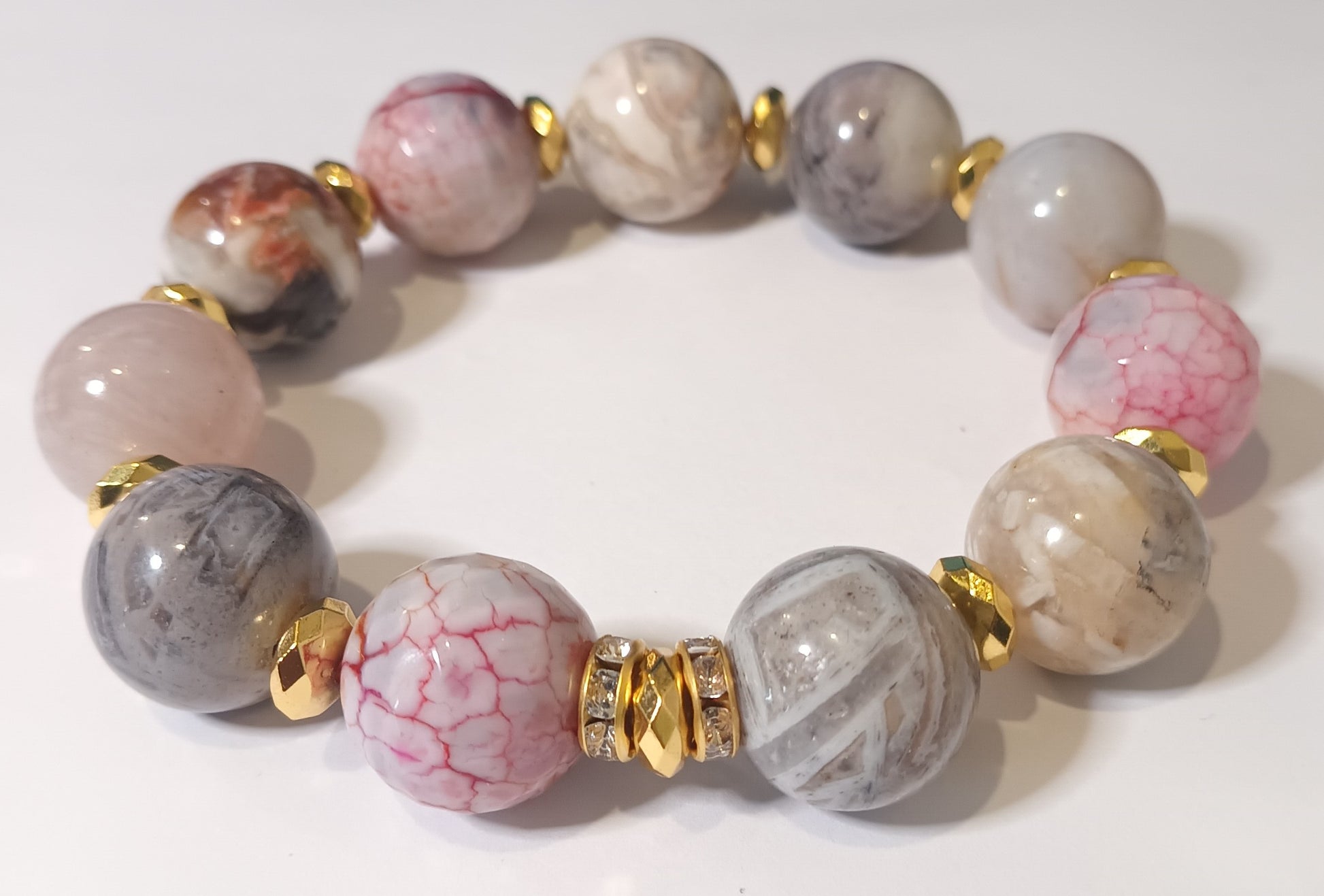 Single gemstone beaded bracelet made with Fire Agate & Crazy Lace Agate gemstones accented in gold with large focal bead!