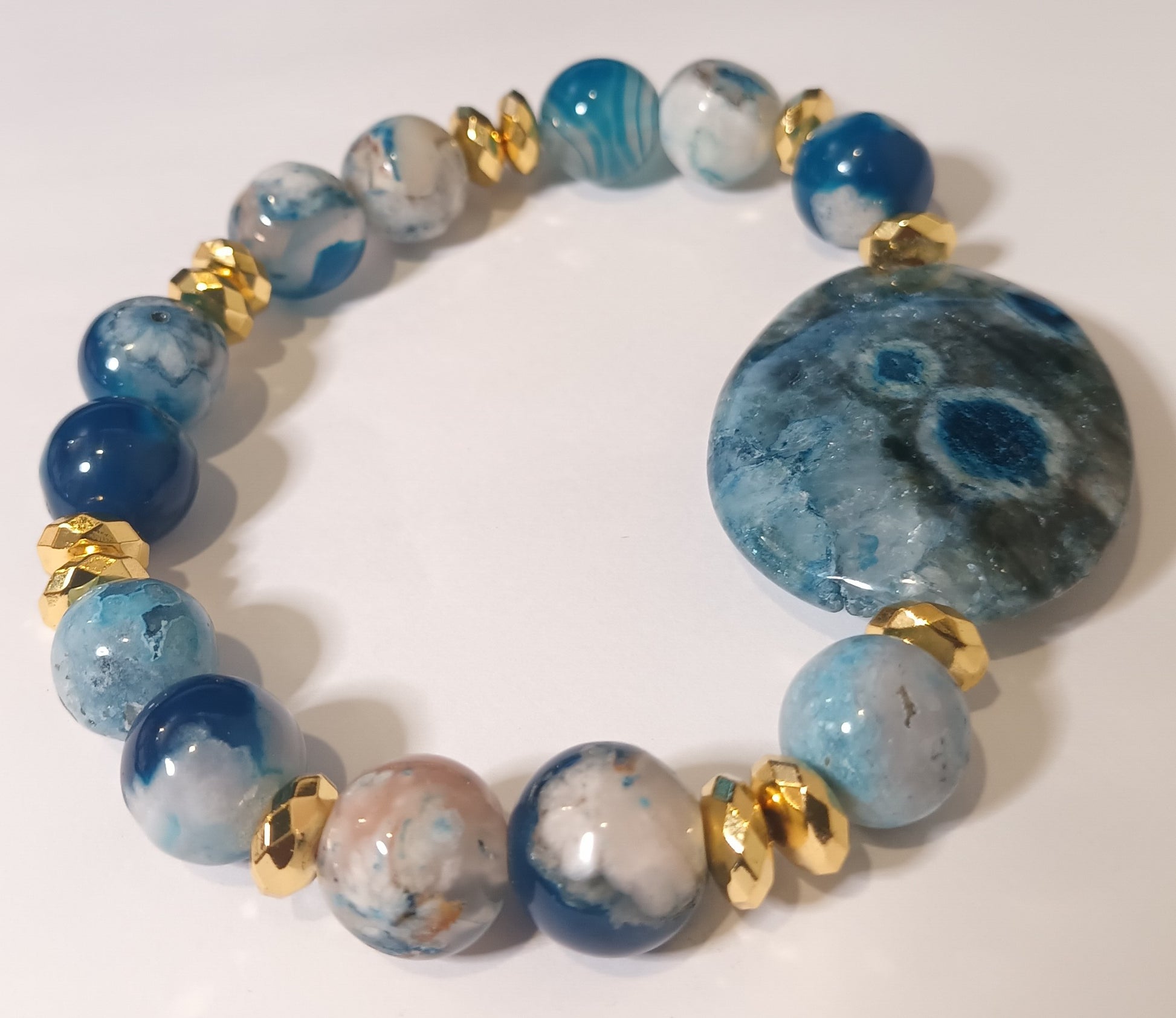 Experience the stunning beauty of our single chunky beaded bracelet, handcrafted with Blue Cherry Blossom and Hematite accented in gold.