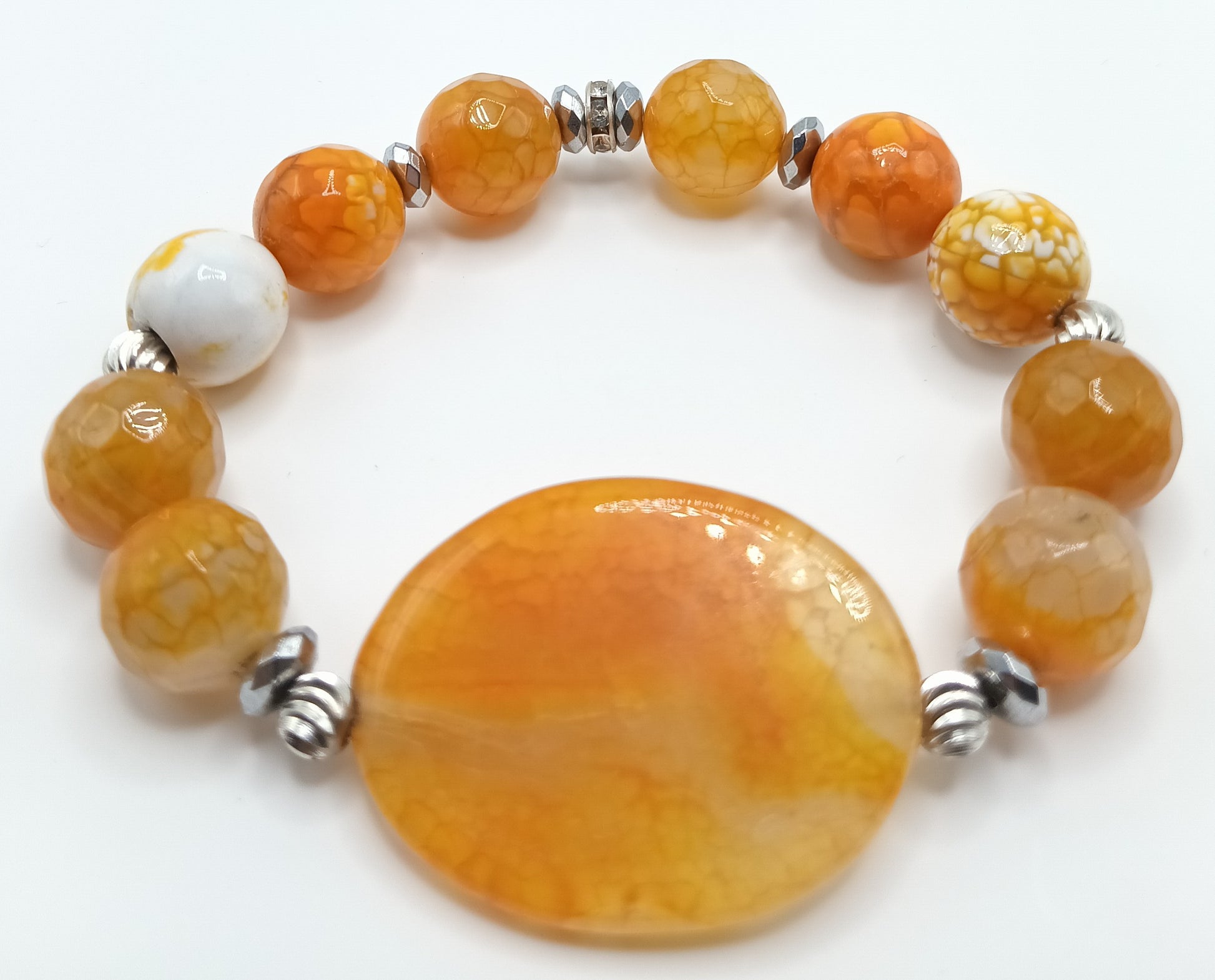 Single chunky gemstone beaded bracelet made with Yellow Fire Agate & Hematite, accented in silver with focal stones!