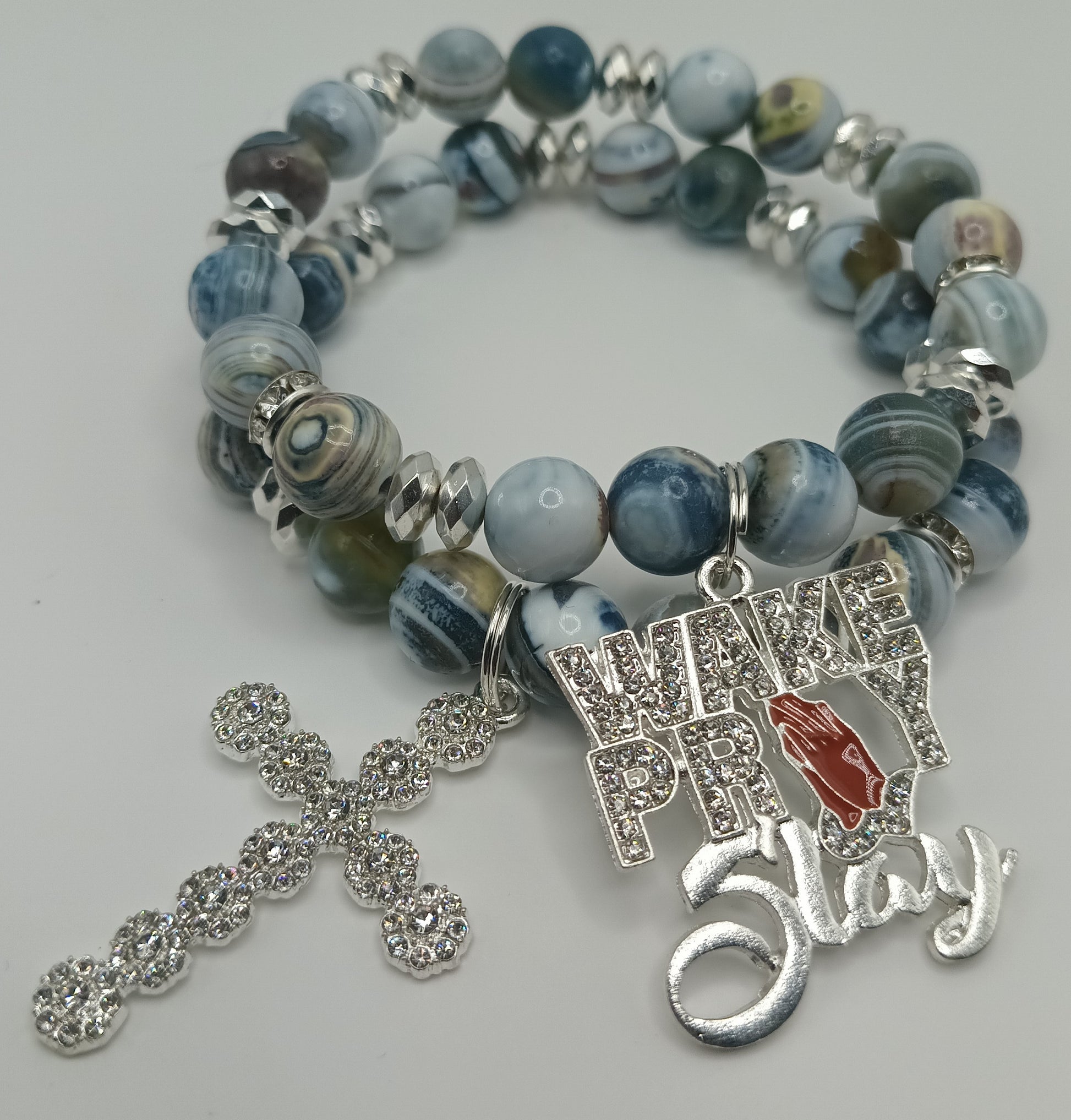 The set includes two stackable pieces with Botswana Agate and Hematite silver accents, as well as a charm with the empowering message "Wake, Pray, Slay."