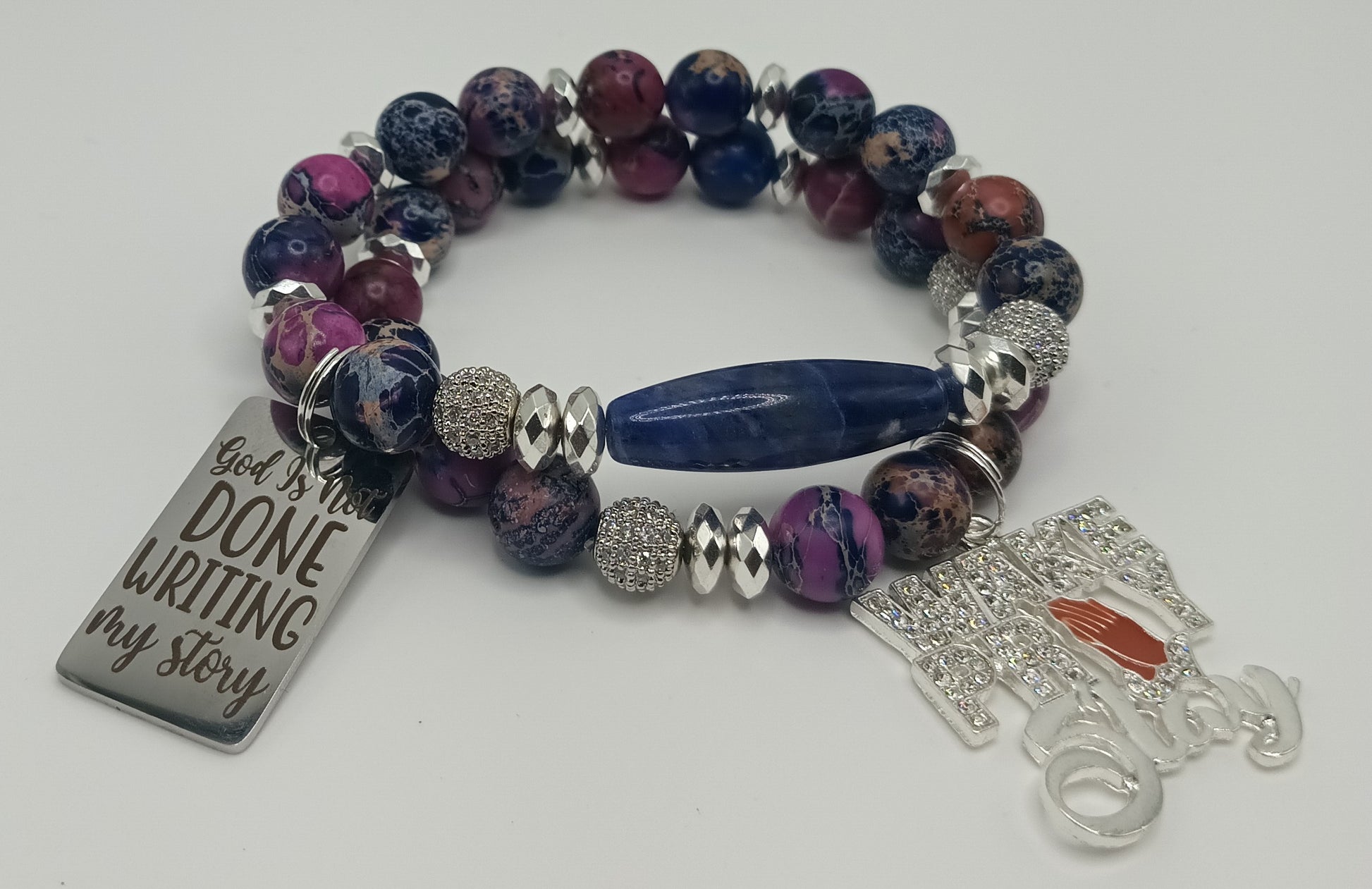 The set includes two stackable pieces with Purple Sea Jasper and Hematite silver accents, as well as a charm with the empowering message "Wake, Pray, Slay & God is Not Done Writing My Story".