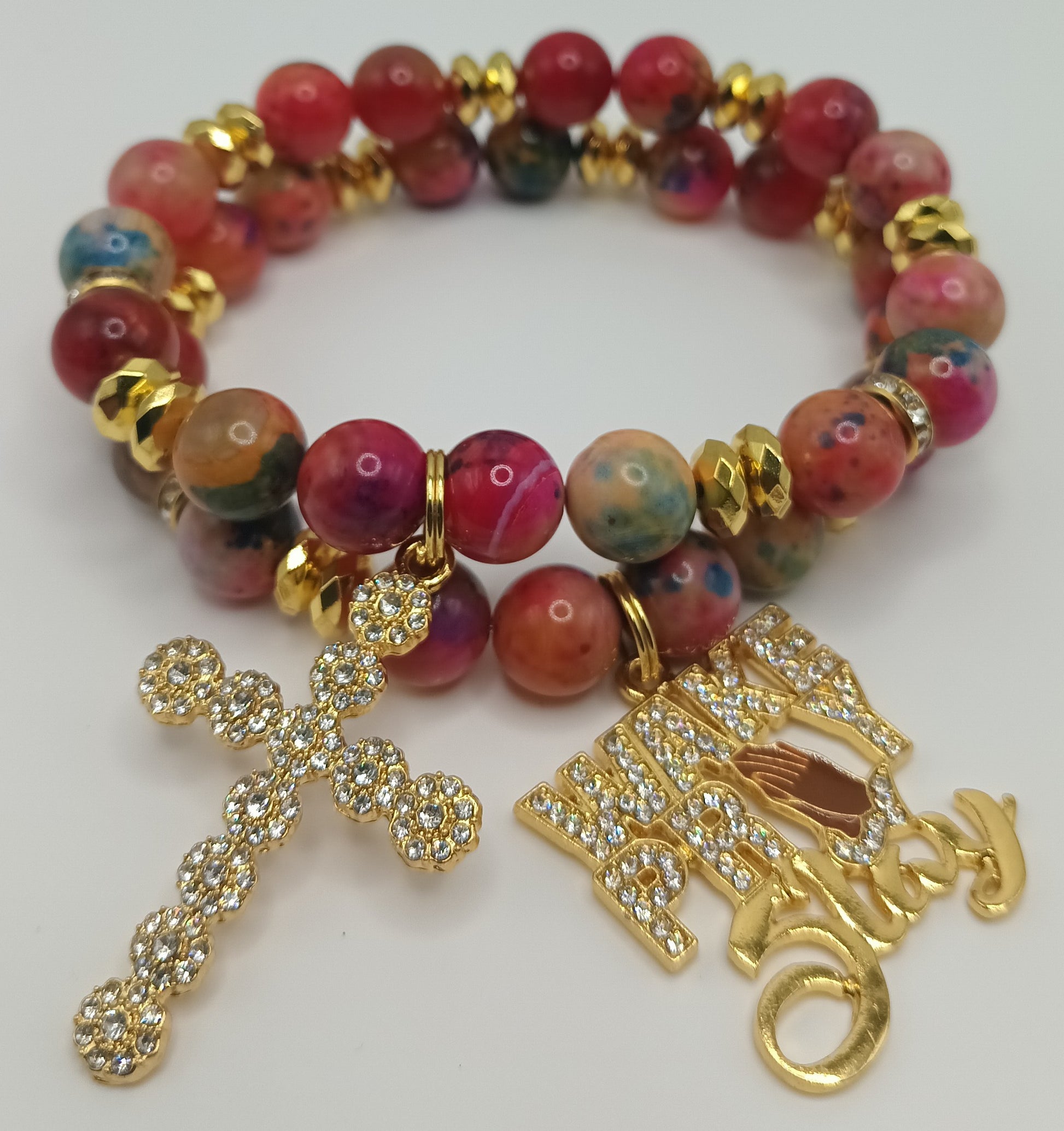 The set includes two stackable pieces with Multi Colored Fire Agate and Hematite gold accents, as well as a charm with the empowering message "Wake, Pray, Slay" & A Gold Bling Cross.